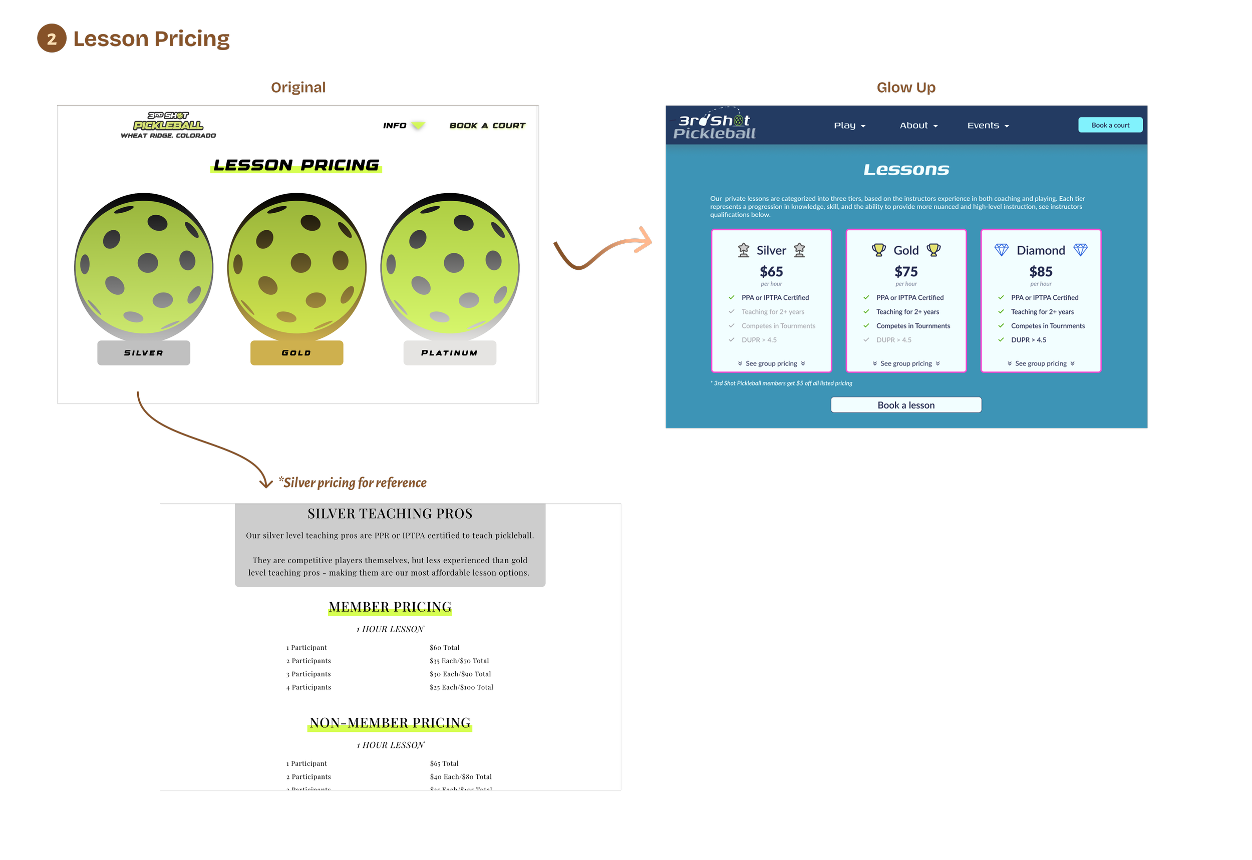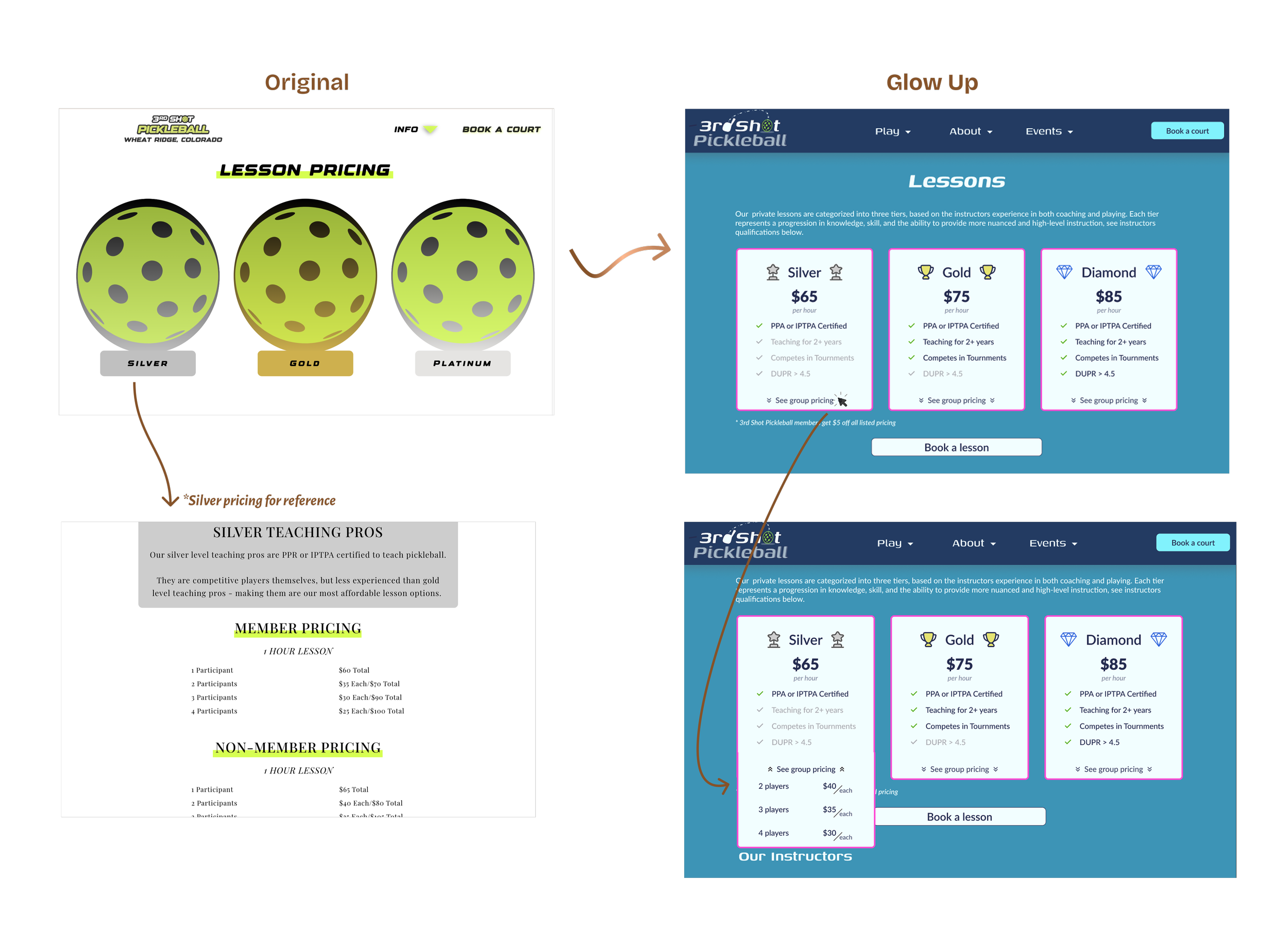 As an example, take a look at the updated user flow for Private Lesson pricing. Previously, the user had to click into each tier (Silver, Gold, and Platinum) to see the pricing. The updated flow only contains one click to see pricing for all three tiers (Silver, Gold, Diamond). Making it easier for the user to see and compare prices.