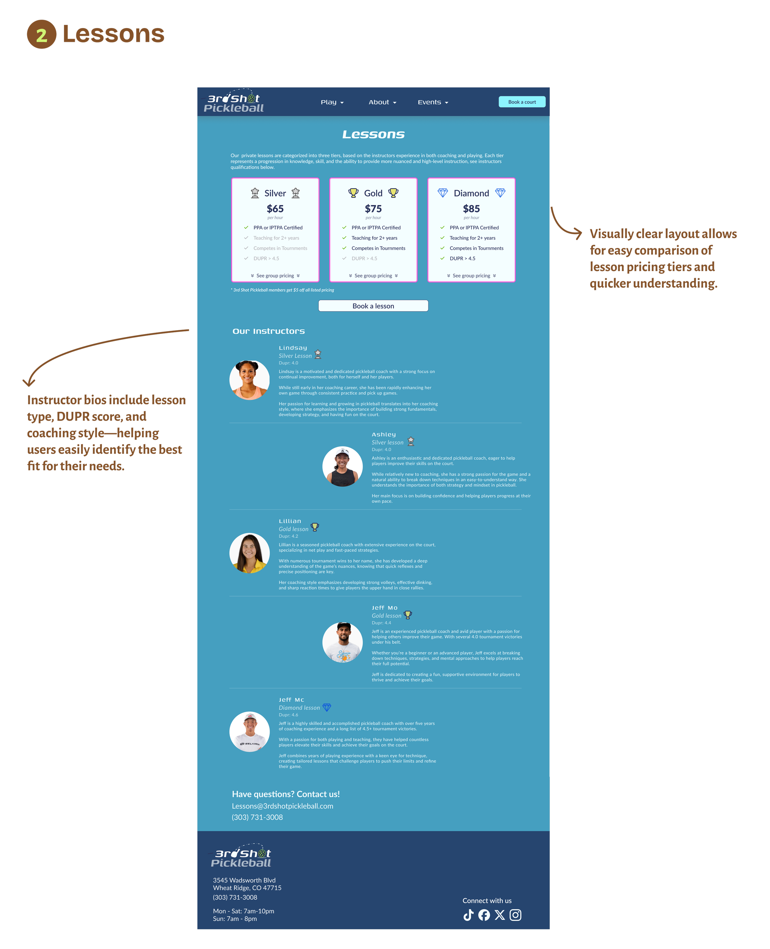 I led a website redesign for 3rd Shot Pickleball to address critical usability issues that were causing users to abandon the site in favor of third-party booking platforms.
